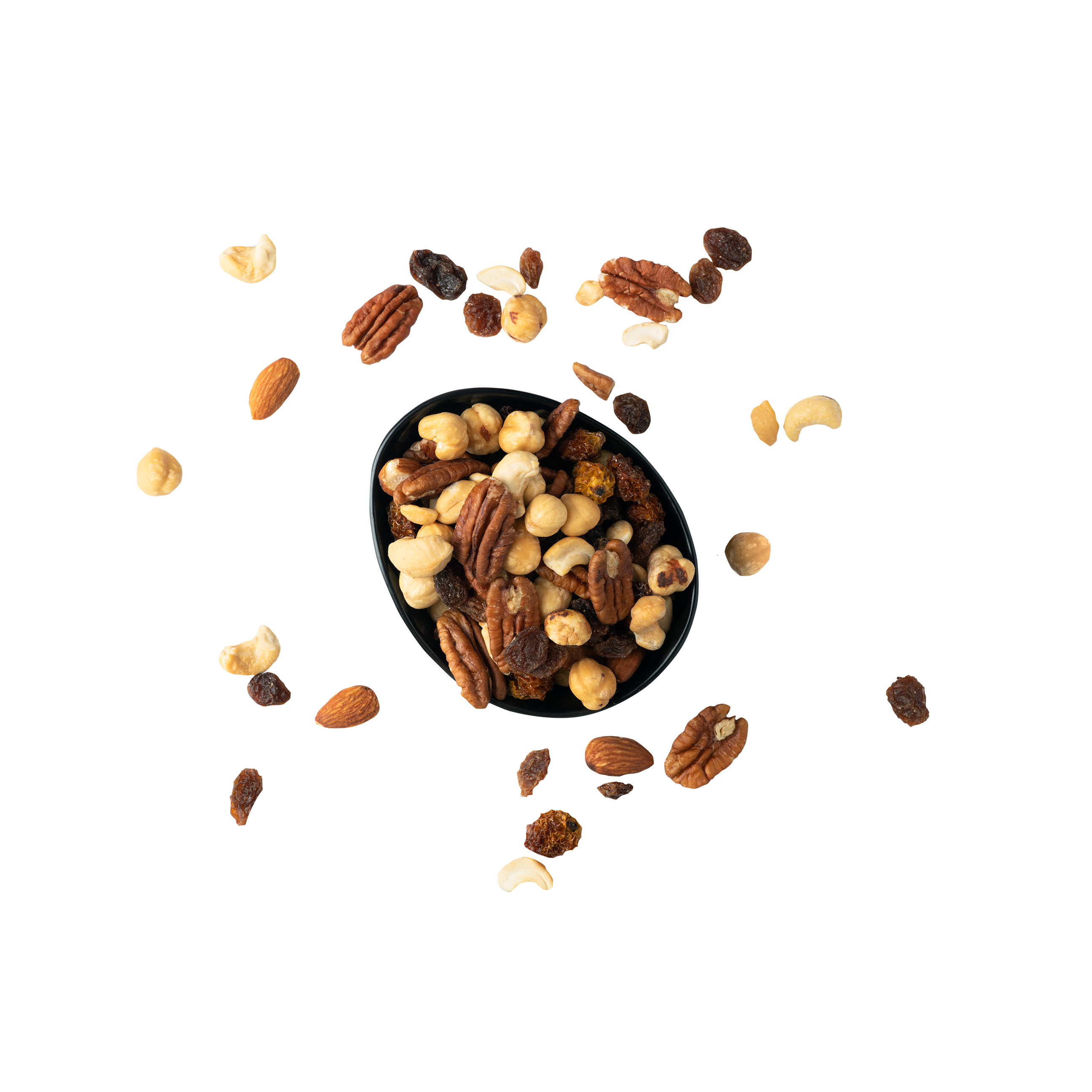 Lahodná zmes pražených mandlí, piemontských lieskových orechov, pražených kešu orieškov, pekanových orechov, physalisu a sušených hrozienok.