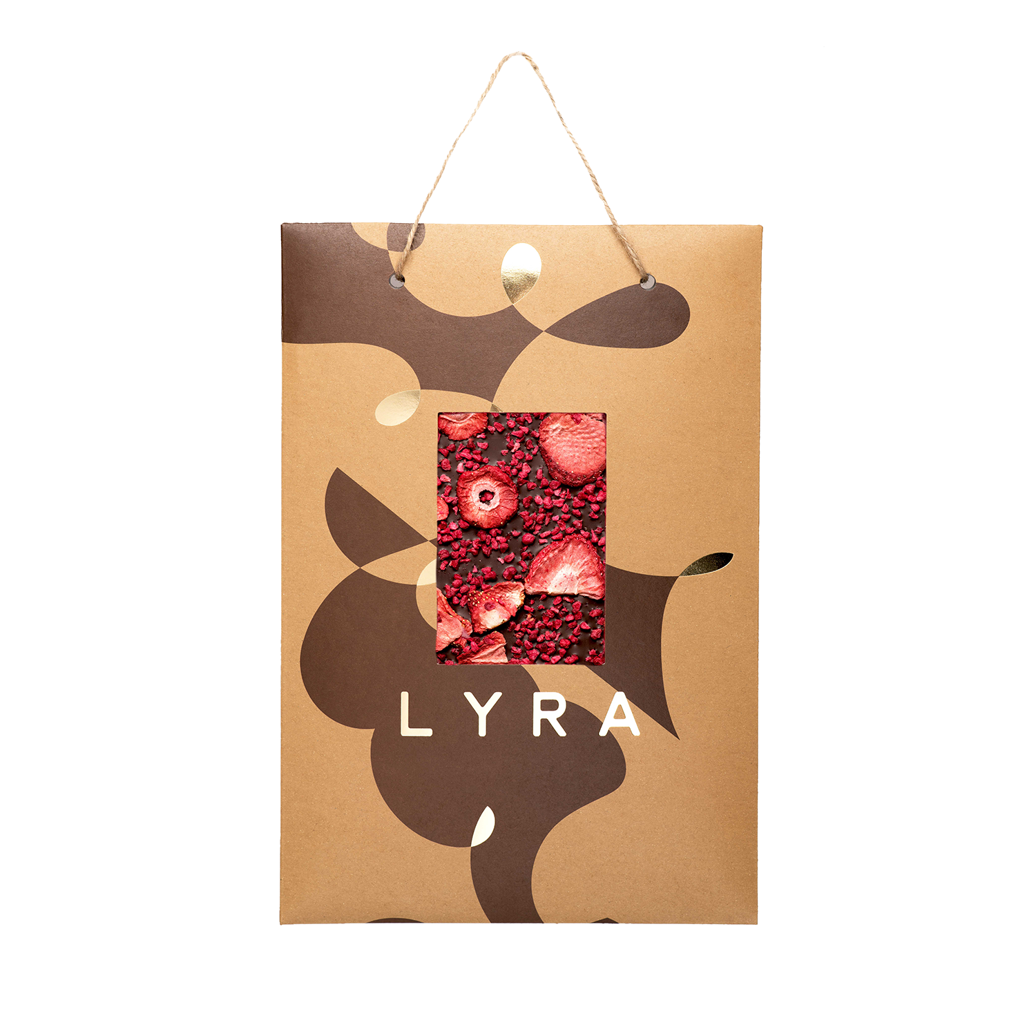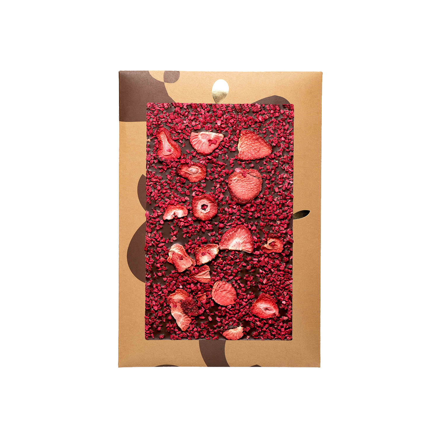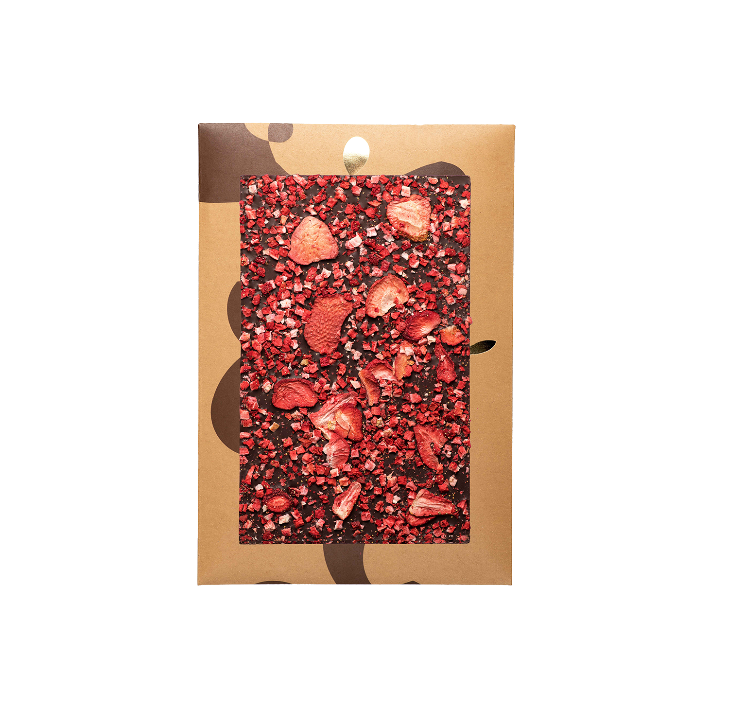 300g prémiovej kolumbijskej horkej čokolády posypanej ingredienciami ako napr: lyofilizované jahody, maliny, fialkové kvety, ružové kvety, mätové lístky…