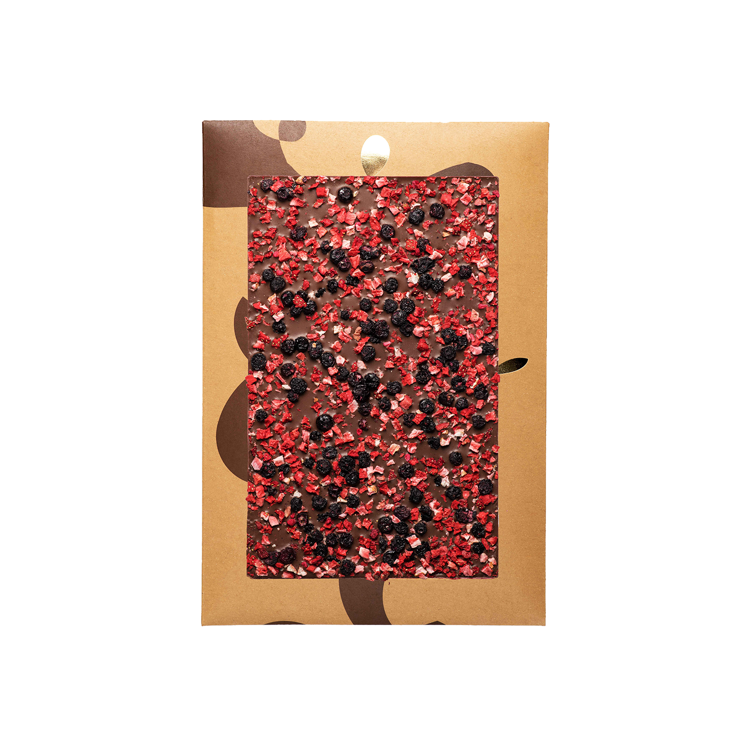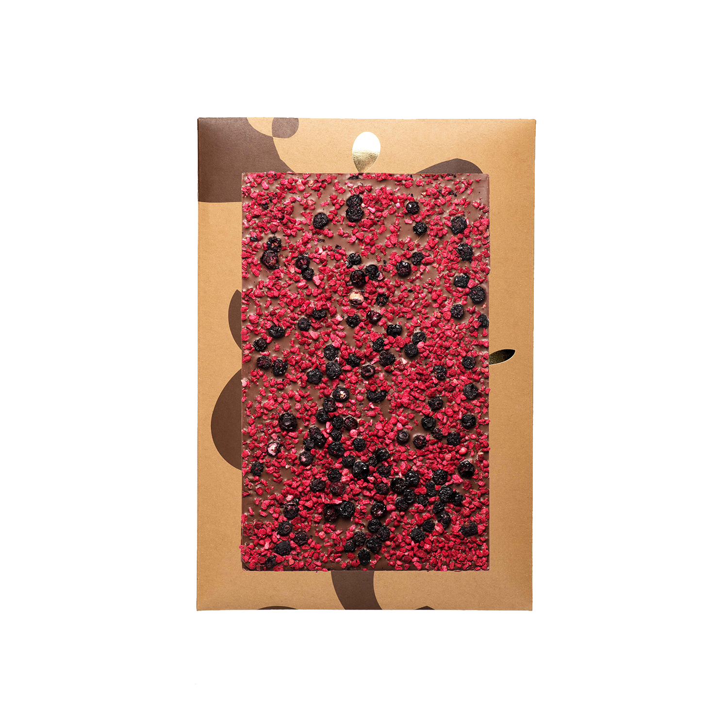 Exkluzívna ručne vyrobená mliečna čokoláda s ovocným posypom.