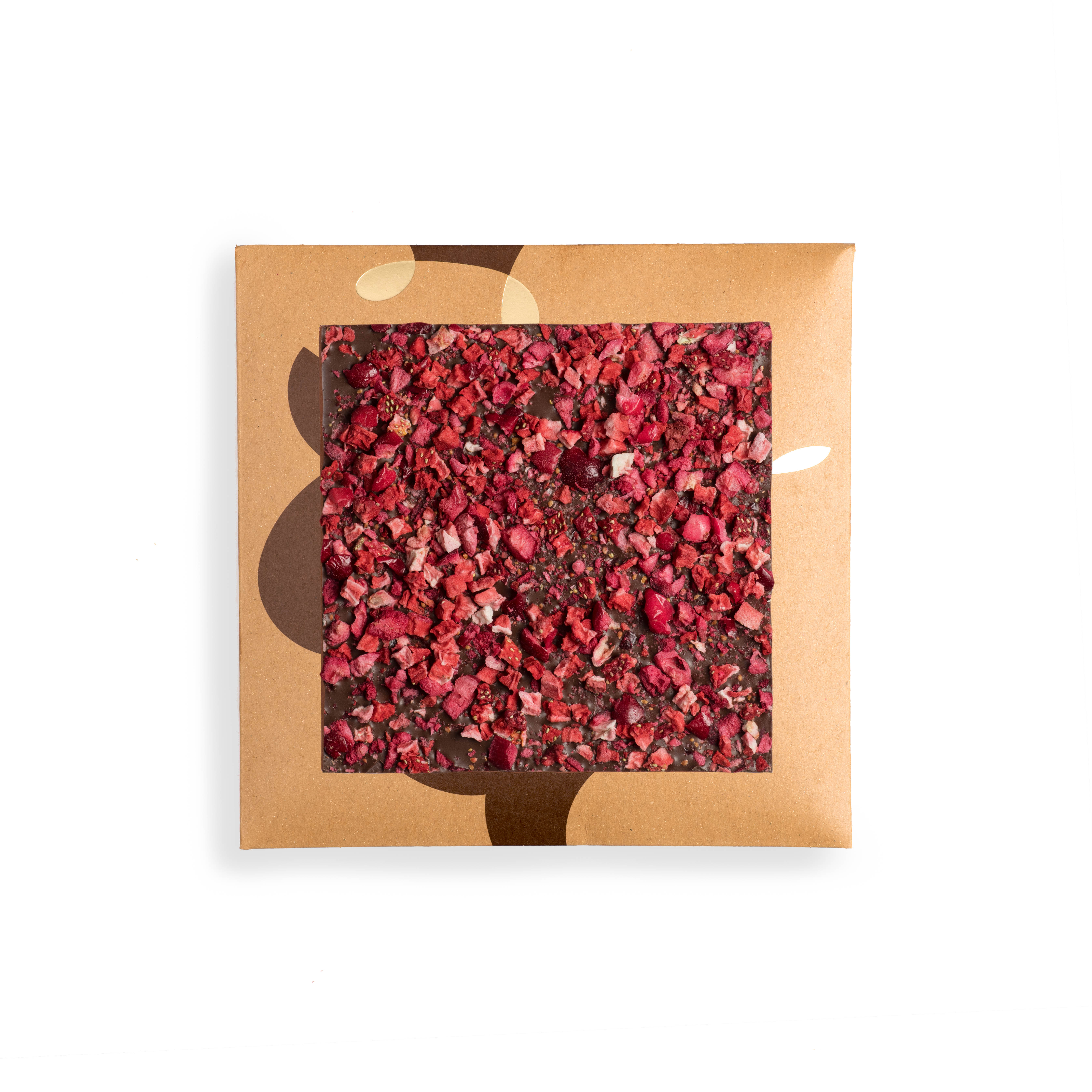 Mliečna čokoláda s posypom jahoda a brusnica.