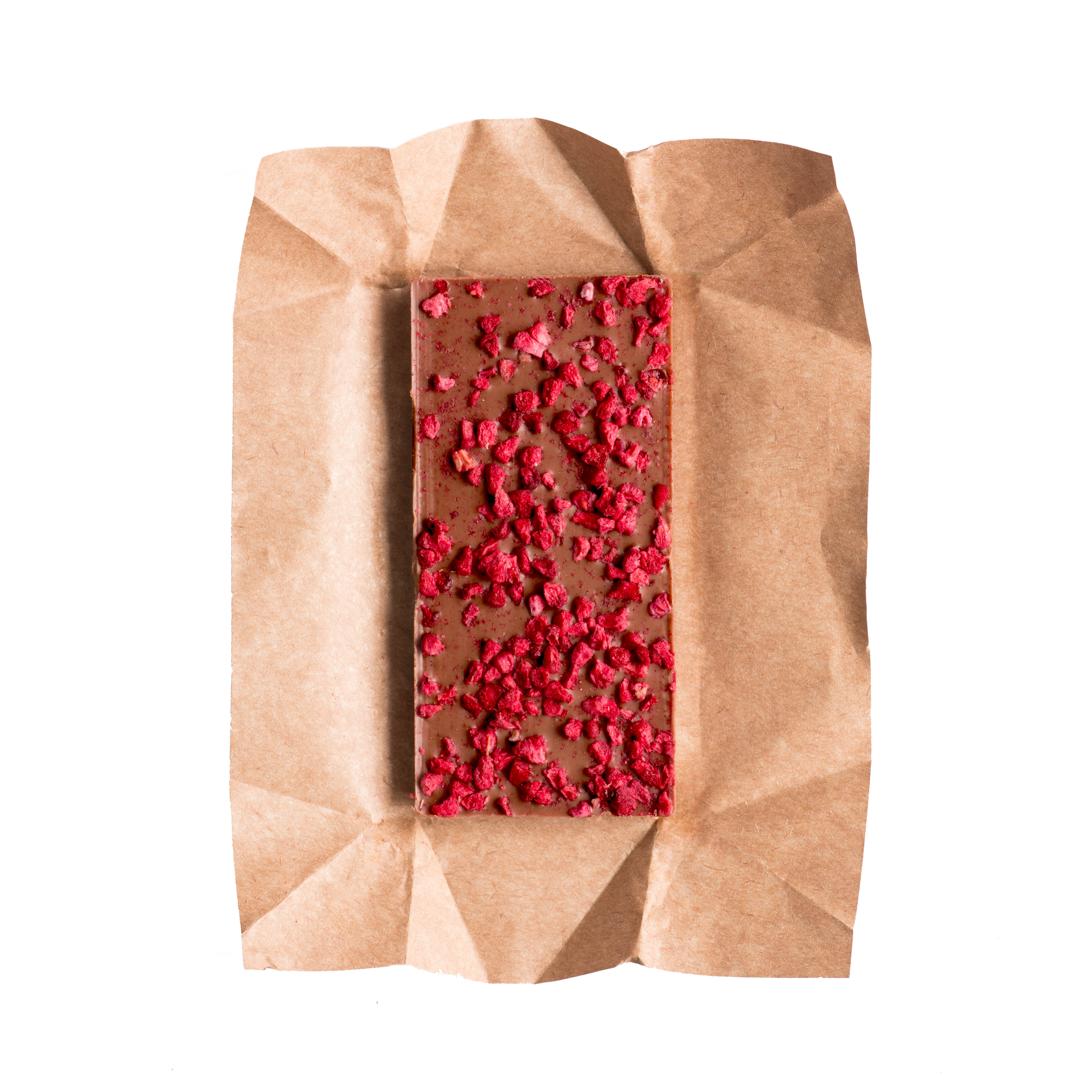 Čokoláda (98%) (kakaové maslo, trstinový cukor, sušený ryžový sirup, kakaové jadrá, mandle. Emulgátor: slnečnicový lecitín, vanilkový extrakt). Posyp: lyofilizované maliny (2 %). Môže obsahovať mlieko, sóju a iné druhy orechov.